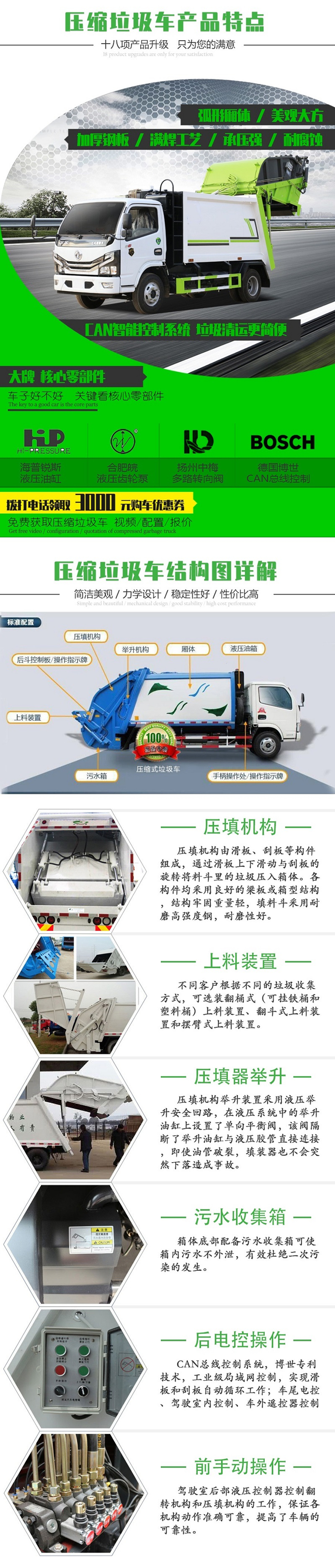 液壓電氣系統(tǒng)配置:采用合肥長源全套齒輪油泵,氣控多路閥,國內(nèi)知名品牌液壓油缸(進(jìn)口油封)高密度高壓油管,進(jìn)口PLC(可編程序**器)智能化集成**(選裝光 電接近開關(guān)實(shí)現(xiàn)全自動化**)可室內(nèi)外操作,真正實(shí)現(xiàn)整車的機(jī)電液一體自動化**,標(biāo)配先導(dǎo)型液壓油高壓過慮器.舉升油缸帶平衡閥,整車帶蠕動壓縮,雙向壓縮功能 ,壓縮效率高,垃圾裝載量大。
